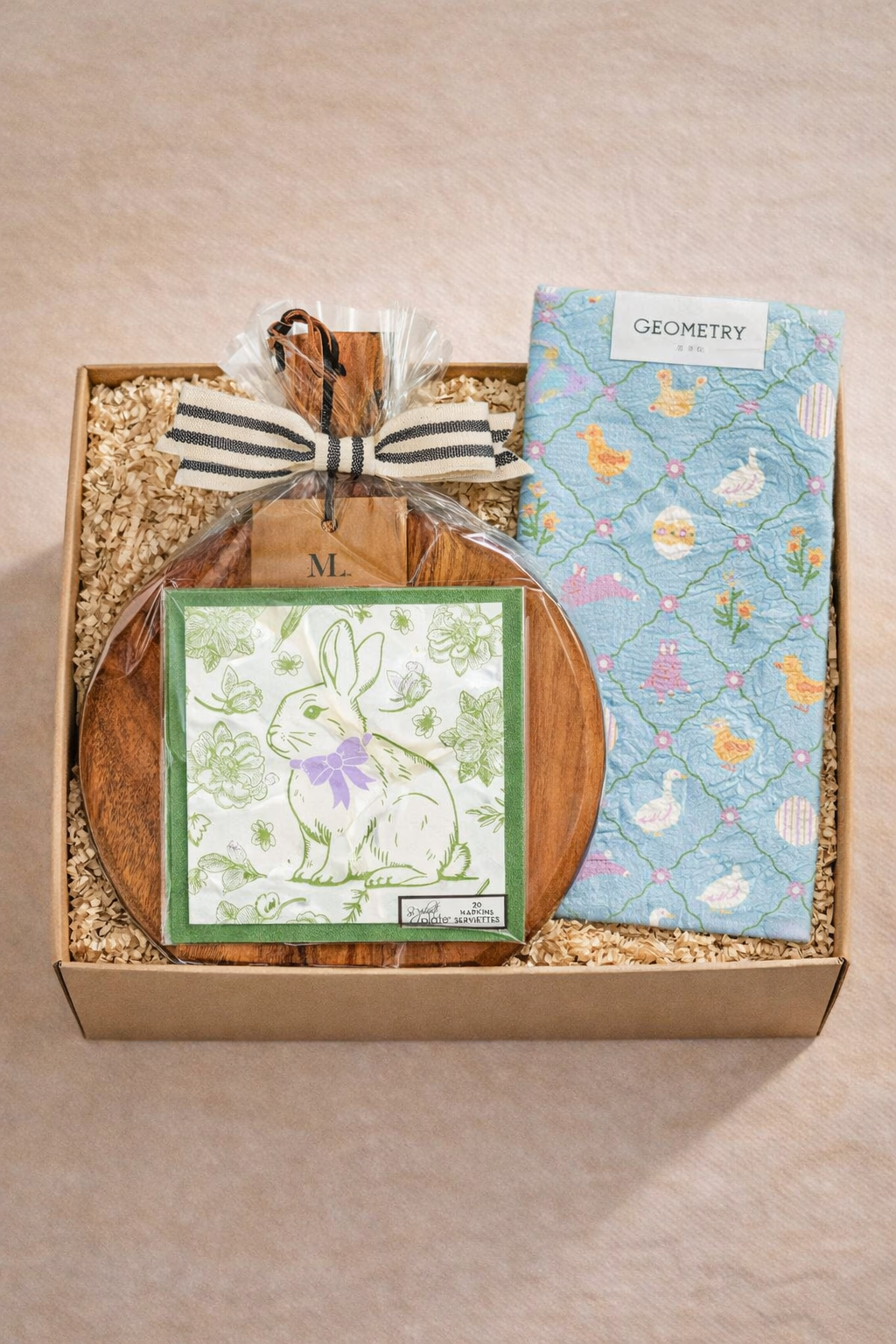 A cheerful nod to spring gatherings and Easter tables. This sweetly styled gift box pairs a Sophistiplate acacia wood board set with charming bunny-print napkins and a playful pastel tea towel from Geometry. Equal parts cute and elevated, it’s perfect for Easter hosting, spring thank-yous, or a just-because gift that brings a smile.