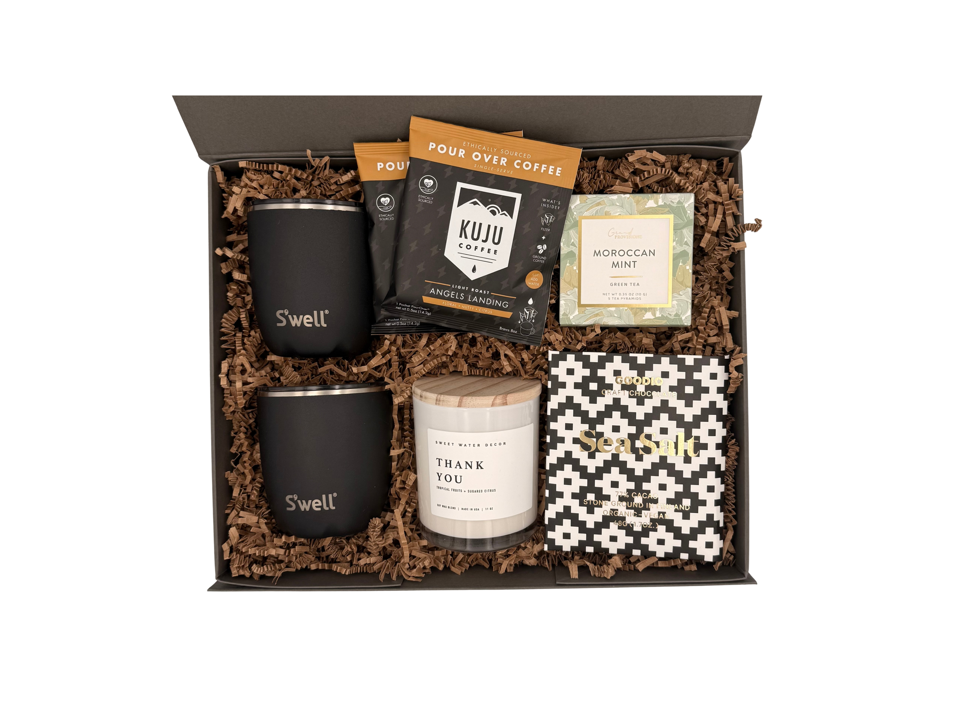 Two matte black S’well 10oz mugs set the tone. Kuju pour over coffee brings rich, easy mornings, while Moroccan Mint Green Tea offers a fresh reset at the end of the day. A “thank you” soy candle adds warmth without saying too much, and Goodio Sea Salt Chocolate delivers the perfect balance of sweet and savory for sharing.