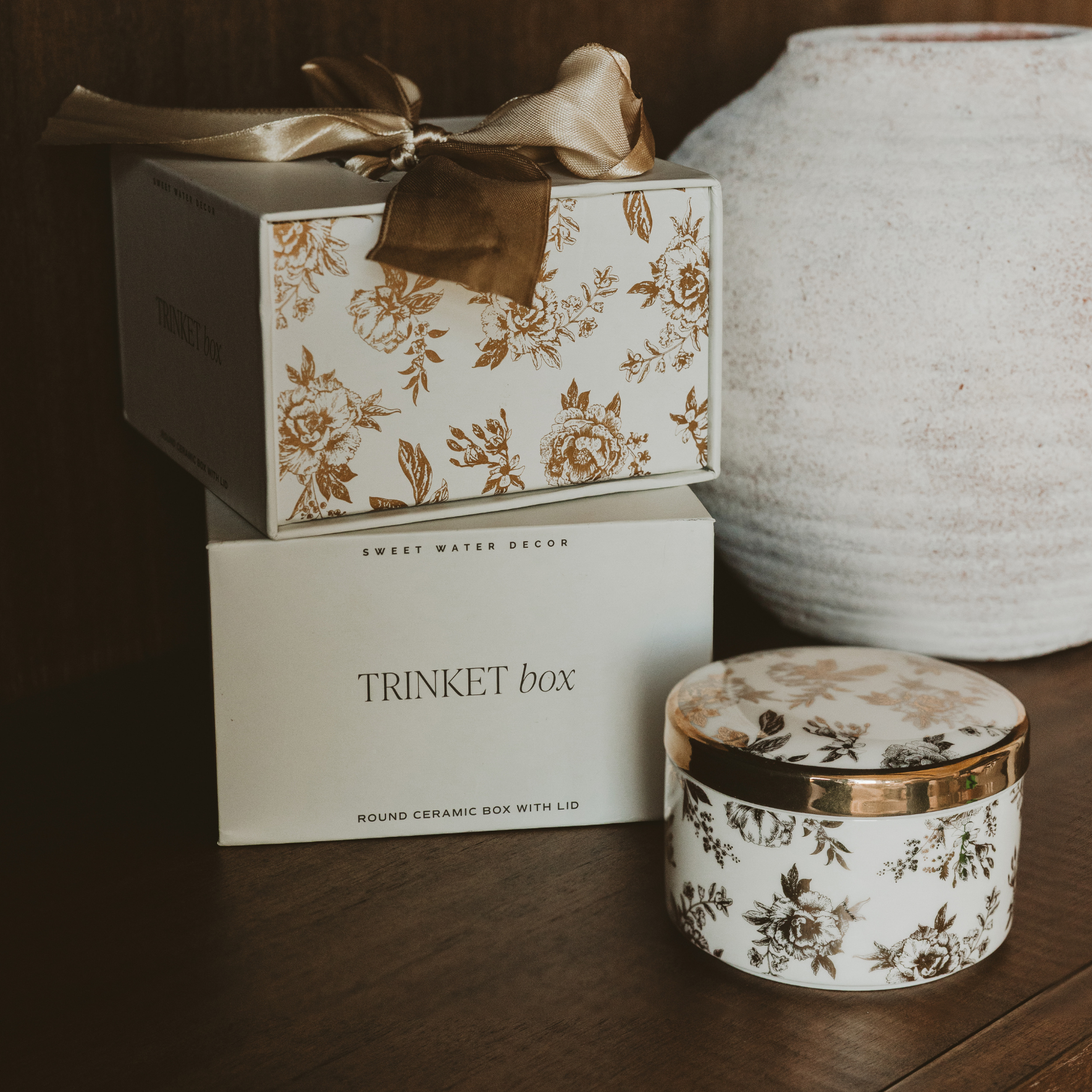 Keep your precious trinkets tucked away in this elegant Gold Delft Trinket Dish—a sophisticated little vessel that doubles as décor. The hand-painted ceramic design features a timeless gold delft pattern that adds a refined touch to nightstands, vanities, or shelves. Its fitted lid ensures your rings, necklaces, and small treasures stay secure and dust-free. Already wrapped in a ribbon-topped gift box, it's ready to delight someone special (or yourself).