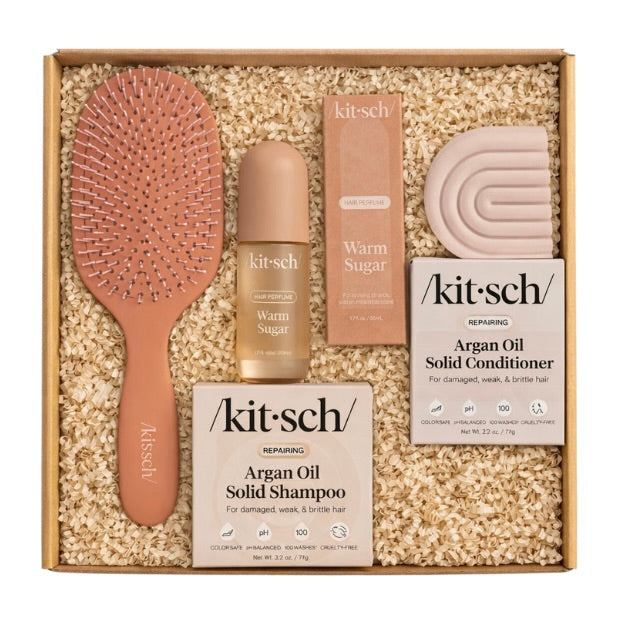 This gift box pairs repairing hair care with a comforting fragrance and an everyday essential brush—bringing together function, feel-good formulas, and a grounded, earthy palette.