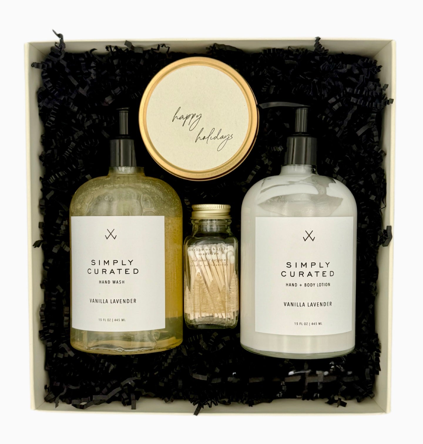 This Simply Curated set features their Vanilla & Lavender Hand Soap and Hand Lotion duo, paired with a seasonal 4oz tin candle (âHappy Holidaysâ or âFa La Laâ) and Studio Portmanteau matches in a Noble Fir glass jar.